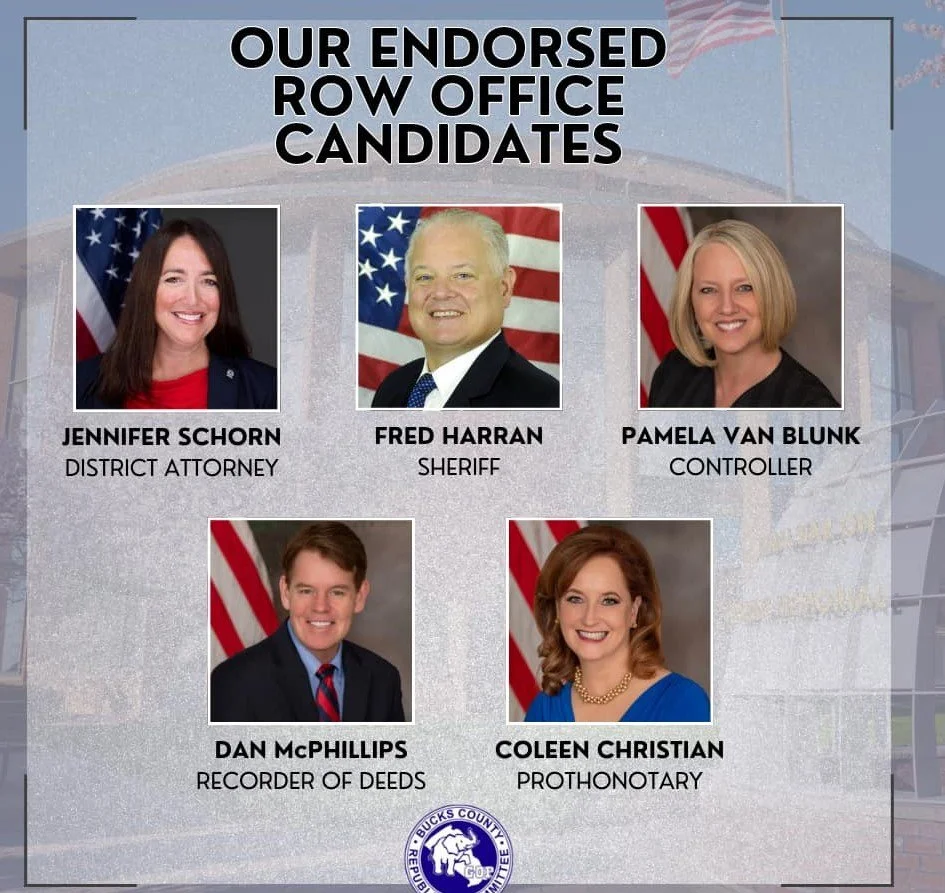 Here is a listing of our endorsed candidates at the County and State levels. For more info, follow this link to the Bucks County Republican Committee County Candidates Page